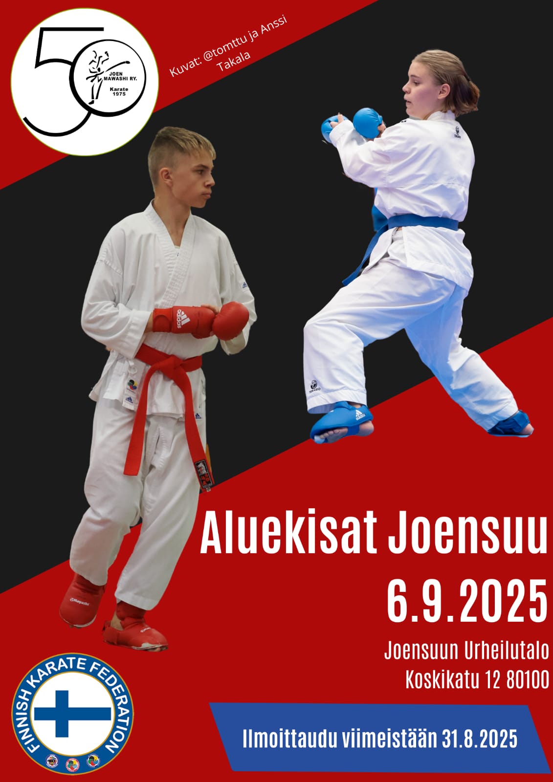 Aluekilpailut (karate) Päivämäärä: 06.09.2025 - 06.09.2025 Sijainti: Joensuu Rekisteröidy viim.: 31.08.2025 Kilpailut
