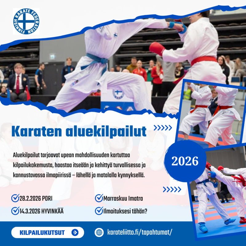 matalan kynnyksen kilpailut (wkf karate) Päivämäärä: 28.02.2026 - 28.02.2026 Sijainti: Pori Kilpailut KILPAILUKUTSU-28.2.2026