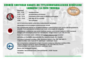 Suomen Shotokan Karate-Do tyylisuuntakollegion kevätleiri Päivämäärä: 07.03.2026 - 07.03.2026 Sijainti: Tuusula Leirit Shotokan karate-do kollegion kevätleiri 7.3.2026