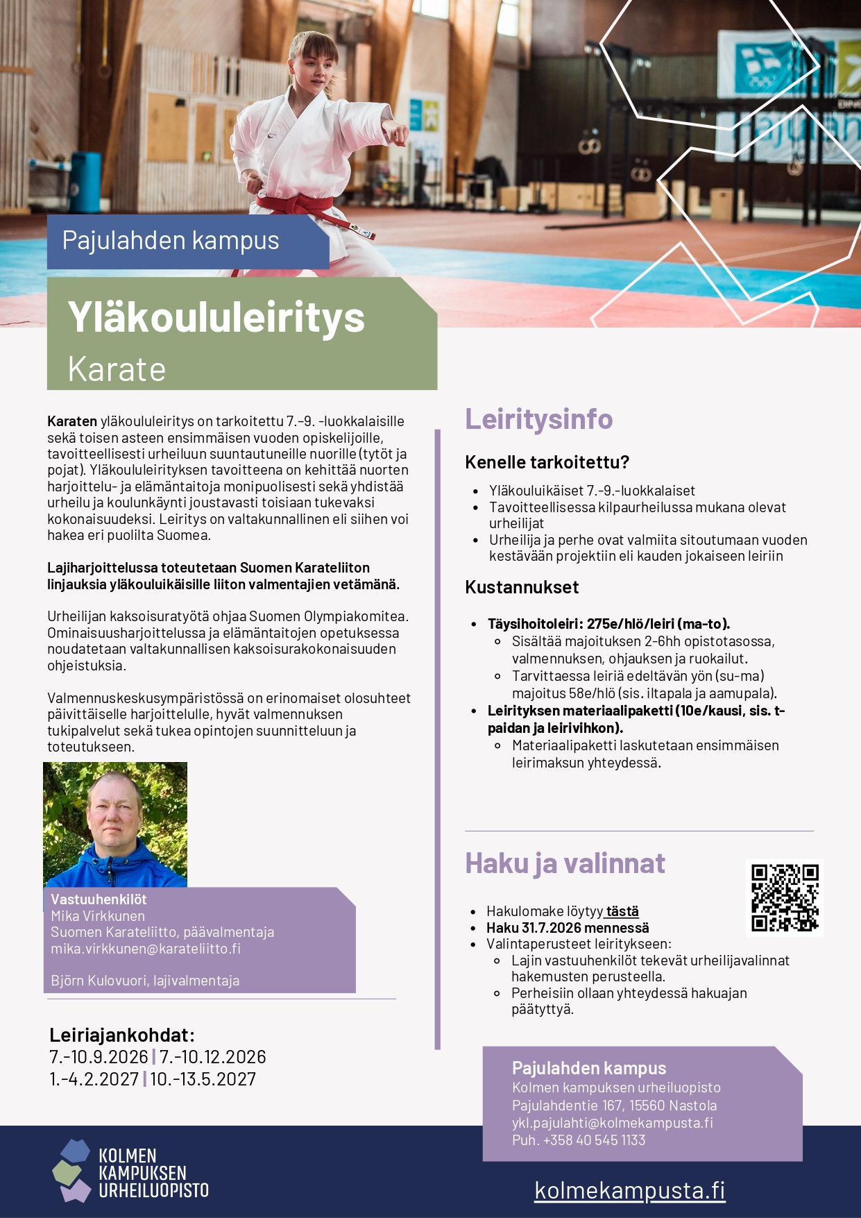 Haku karaten yläkoululeiritykseen 2026-2027 on avattu