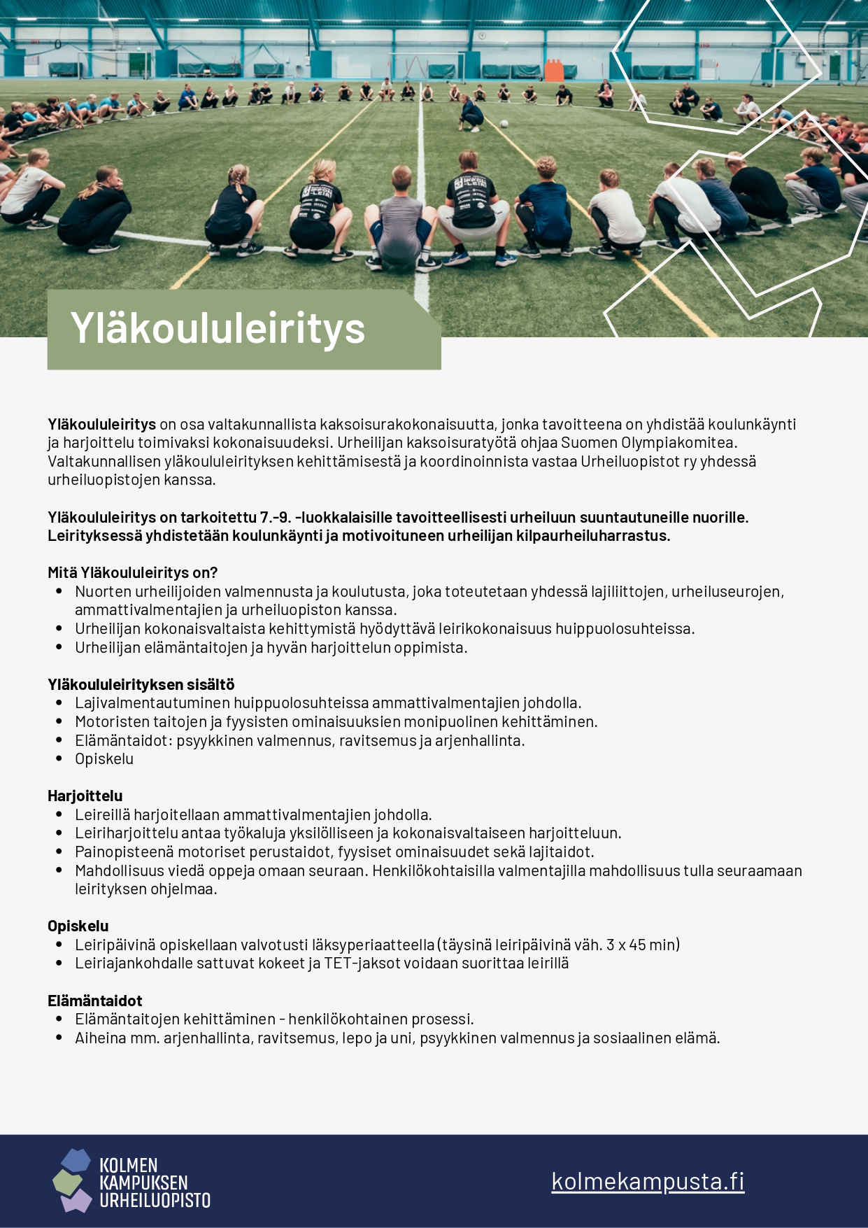 Lisätietoa ja hakulomake: https://www.kolmekampusta.fi/fi/ylakoululeiritys-pajulahden-kampuksella