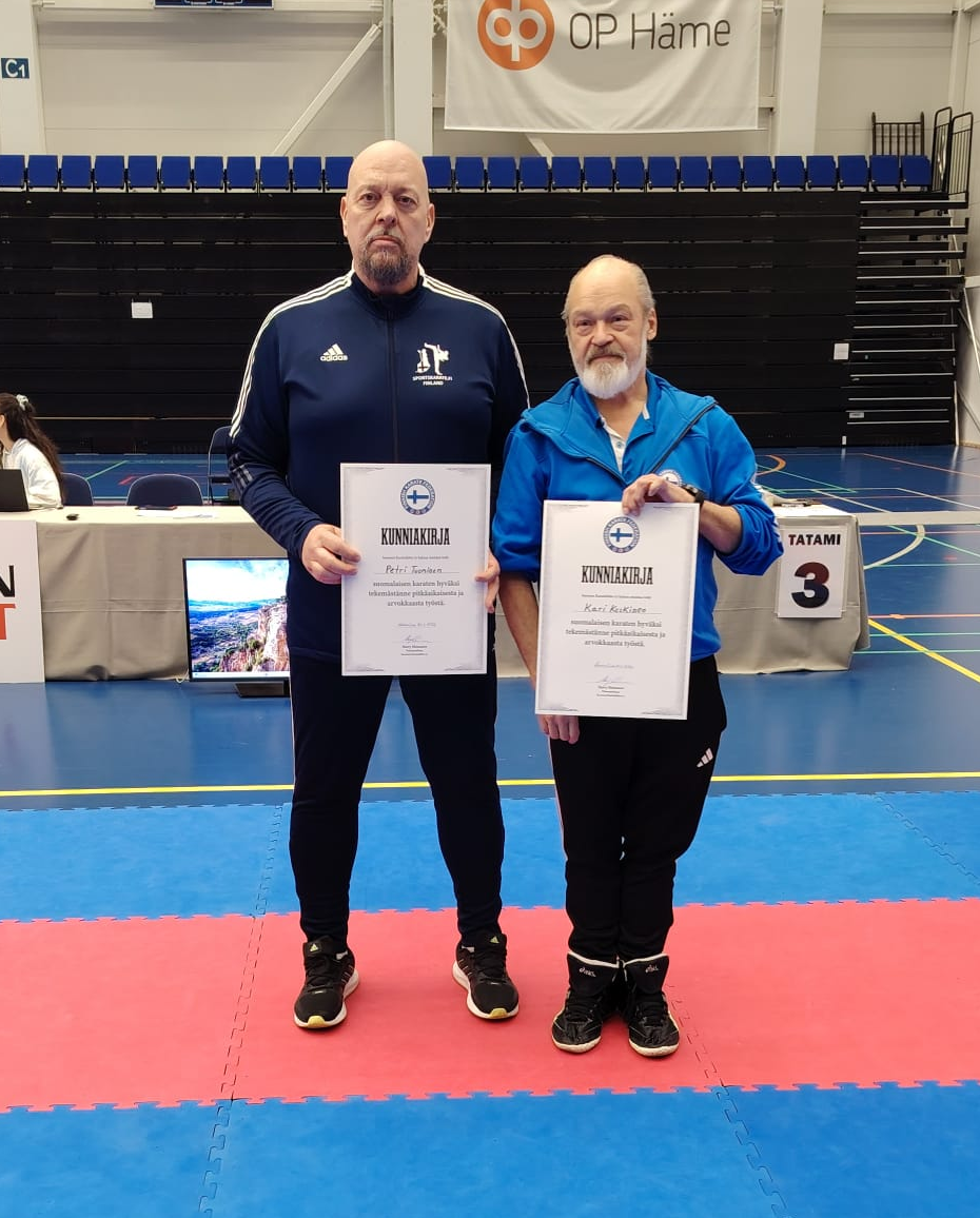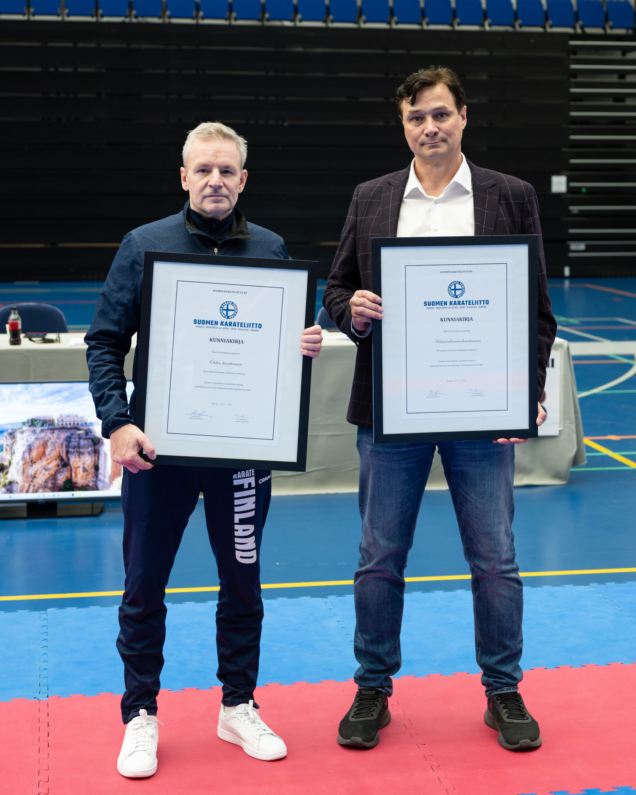 Kari Koskiselle ja Petri Tuomiselle luovutettiin kunniakirjat pitkäaikaisesta työstä Karateliiton toiminnan ja karaten hyväksi, molemmat ovat myös entisiä Karateliiton puheenjohtajia.
